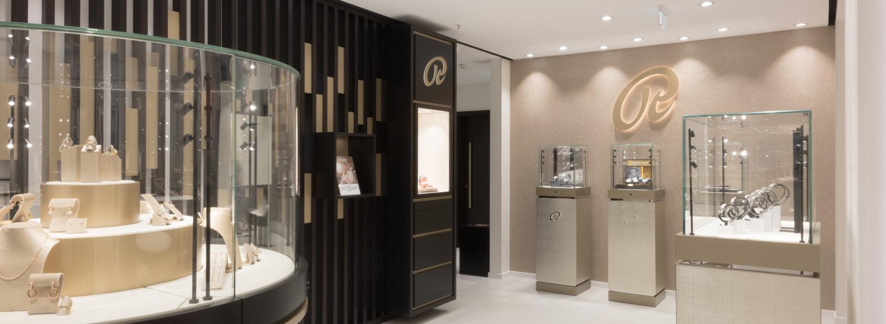 ERSTKLASSIGE OBJEKTEINRICHTUNG VON A-Z ++ Sämtliche Möbel im eleganten Store und in den angrenzenden Backoffice-Bereichen kommen aus unserer technisch-konstruktiven Ideenschmiede – von der Verkaufsfläche über den Tresorraum, die Bäder und den IT-Raum bis hin zum Büro der Filialleitung. Neben Stand- und Rundvitrinen, Theken und Wandmöbeln schließt das selbst Fußleisten, Türen, Fensterbänke und Deckenleuchten mit ein. Ausgenommen nur die Küchenzeile im Pausenraum und der Rolex-Bereich. Mit höchster Präzision entwickelt und produziert an unserem Frankfurter Standort, professionell montiert in Leipzig, trägt die wertige Möblierung unverkennbar unsere Handschrift. In enger Abstimmung mit Architektur und Designabteilung des Kunden ist so ein stimmiges, funktional durchdachtes Gesamtkonzept der Spitzenklasse Realität geworden.
